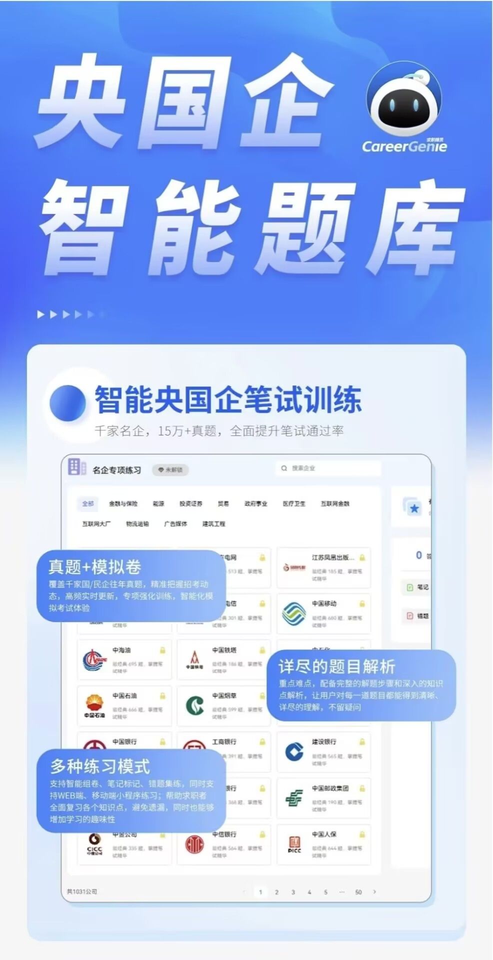 与多家企业HR合作,题库内容真实反映企业笔试难度与类型,覆盖中国银行、工商银行、互联网金融企业、互联网大厂等1031+公司试题。