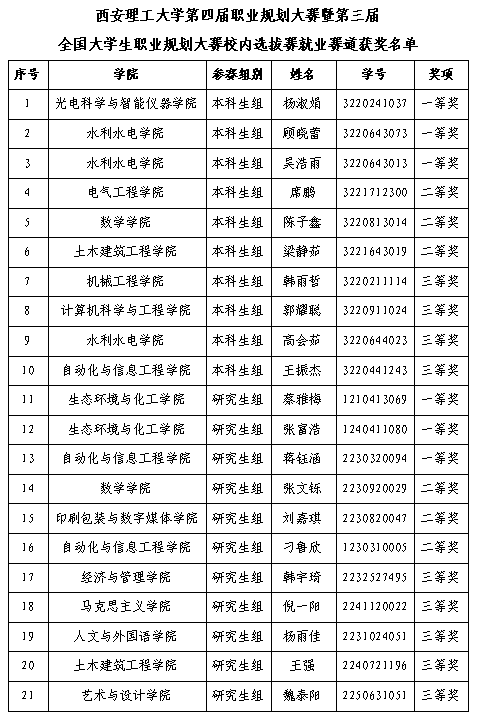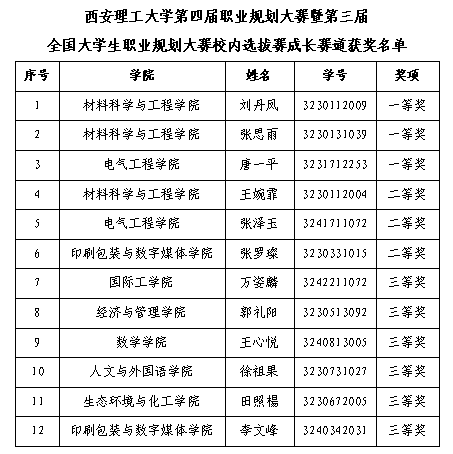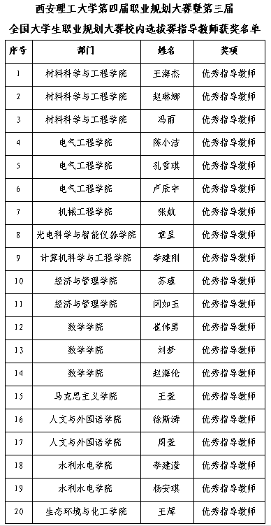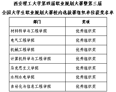 西安理工大学第四届职业规划大赛暨第三届全国大学生职业规划大赛校内选拔赛经院级推荐、校级初赛、决赛,共评出一等奖9项、二等奖9项、三等奖15项、优秀指导教师29项、优秀组织奖7项。现将获奖结果予以公布。